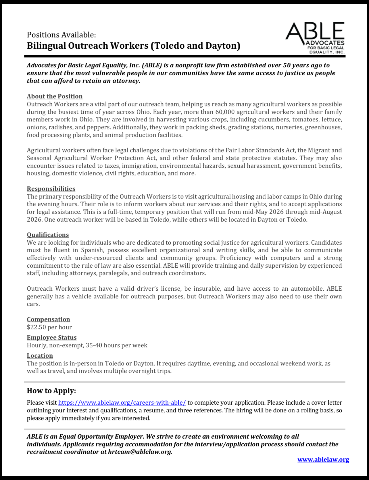 The primary responsibility of the Outreach Workers is to visit agricultural housing and labor camps in Ohio during the evening hours. Their role is to inform workers about our services and their rights, and to accept applications for legal assistance. This is a full-time, temporary position that will run from mid-May 2026 through mid-August 2026. One outreach worker will be based in Toledo, while others will be located in Dayton or Toledo.